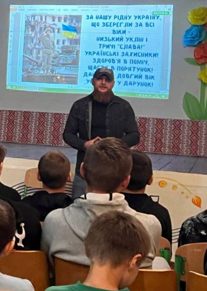 Юрій поділився з учнями своєю історією — про фронтові будні, важкі бої, поранення, полон і непростий шлях відновлення. Його розповідь — це не просто спогади про війну, а урок мужності, сили духу та віри, який торкнувся кожного присутнього.