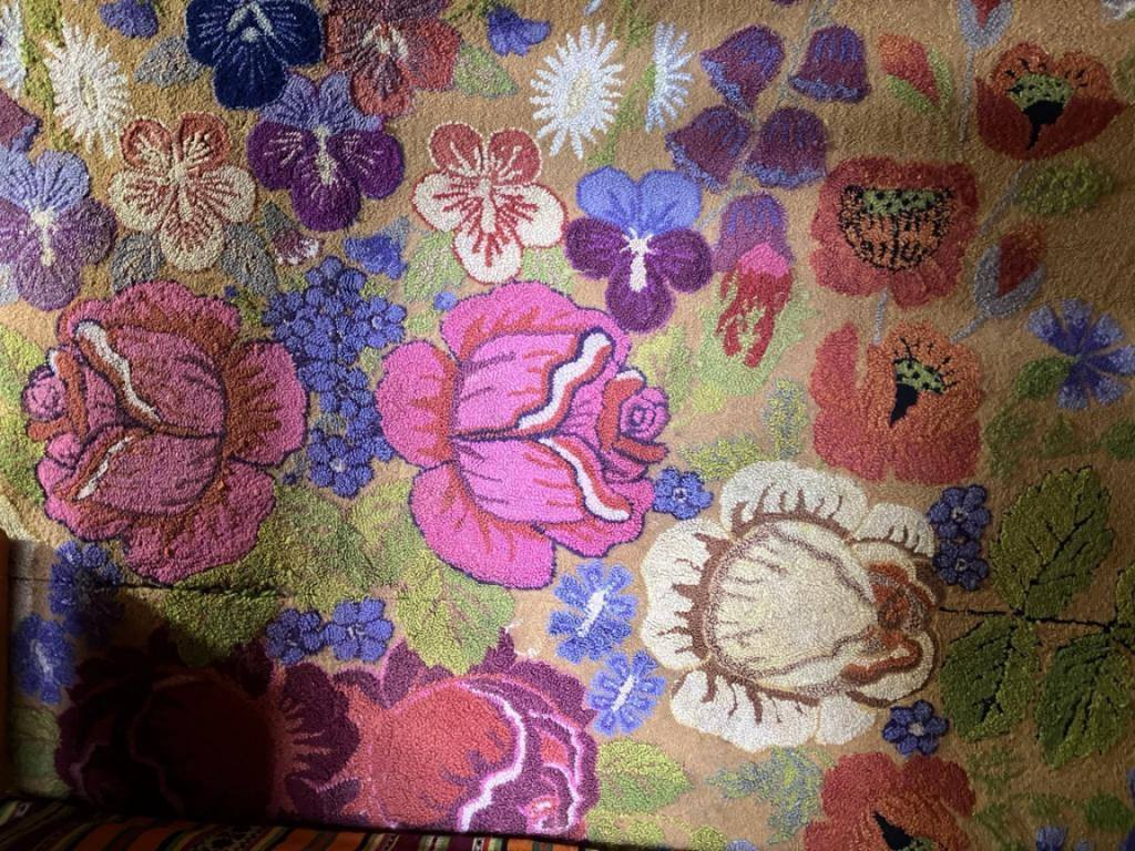 На бежевому тлі килима розквітає пишна й яскрава квіткова композиція — поєднання краси, історії та автентики. Такий виріб не лише прикрашає інтер’єр, а й зберігає живий зв’язок поколінь.