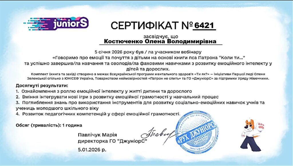 Калинівську публічну бібліотеку на вебінарі представляли Олена Костюченко, завідувачка Калинівської дитячої бібліотеки, та Діна Низькоклон, методист публічної бібліотеки. Учасники заходу опановували сучасні методики роботи з дитячими емоціями, вчилися говорити з дітьми про почуття, допомагати їм розпізнавати та проживати емоційні стани, що особливо важливо в умовах війни.