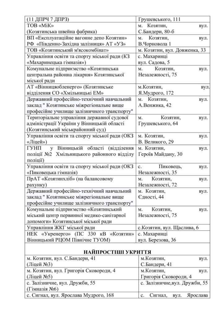Козятинська міська рада оприлюднила актуальний перелік укриттів, куди можна сховатися під час повітряної тривоги та інших надзвичайних ситуацій.