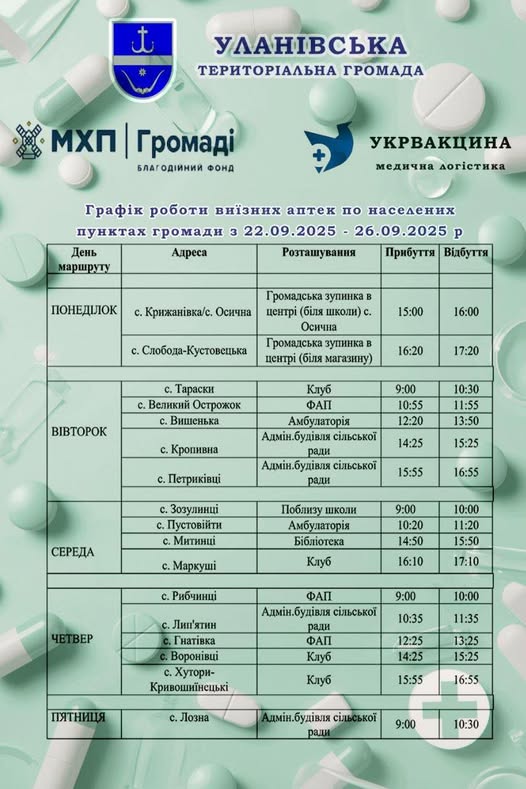 Графік роботи виїзної аптеки в Уланівській громаді з 22 по 26 вересня 2025 року: