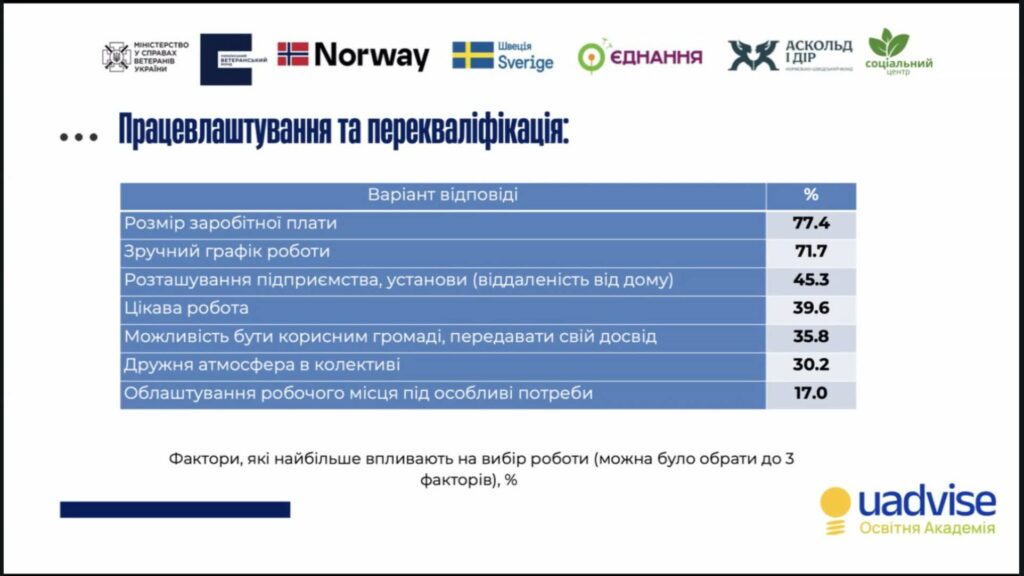 У питанні працевлаштування ветерани чітко окреслили пріоритети: рівень заробітної плати, зручний графік та фізичну доступність робочого місця. Водночас лише 17% респондентів повідомили, що їхні робочі місця адаптовані до особливих потреб, що яскраво демонструє розрив між заявами та реальними умовами.