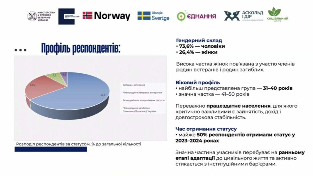 Портрет респондентів свідчить: значна частина ветеранської спільноти перебуває лише на початку повернення до цивільного життя. Понад 73% учасників — чоловіки, майже 26% — жінки, серед яких чимало членів родин військових і загиблих. Найчисельніша вікова група — 31–40 років. Майже половина опитаних отримала ветеранський статус у 2023–2024 роках.