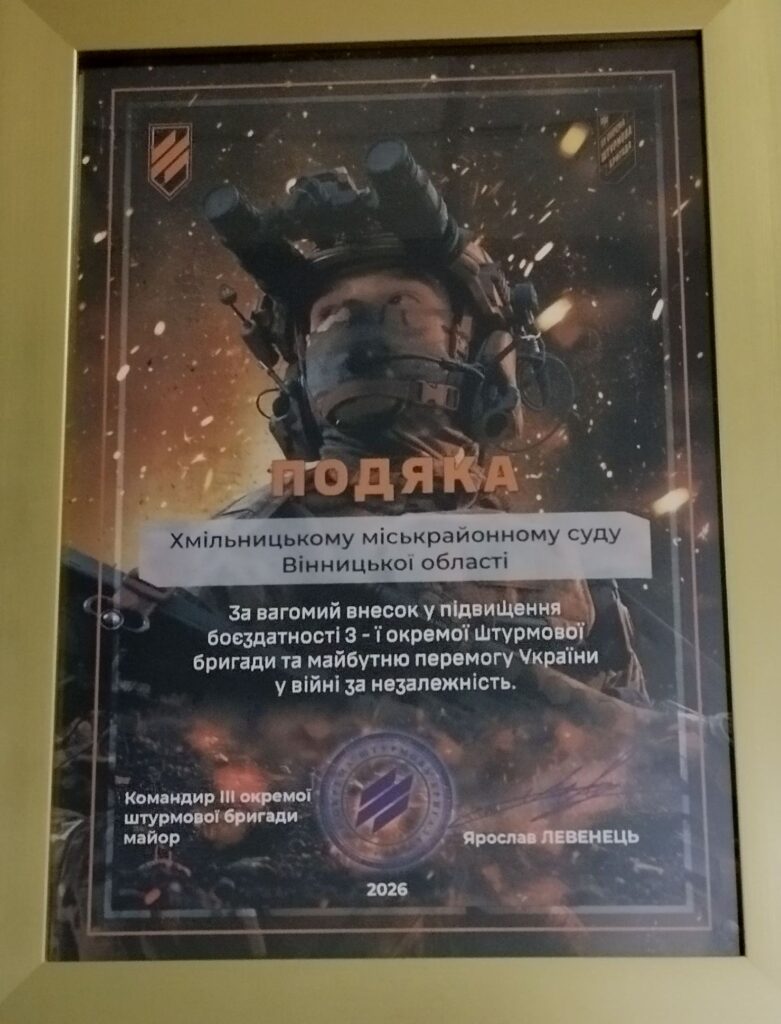 Колектив Хмільницького міськрайонного суду отримав подяку від українських військових. До установи завітали представники Третього армійського корпусу, які відзначили внесок працівників суду у підтримку Збройних сил України.