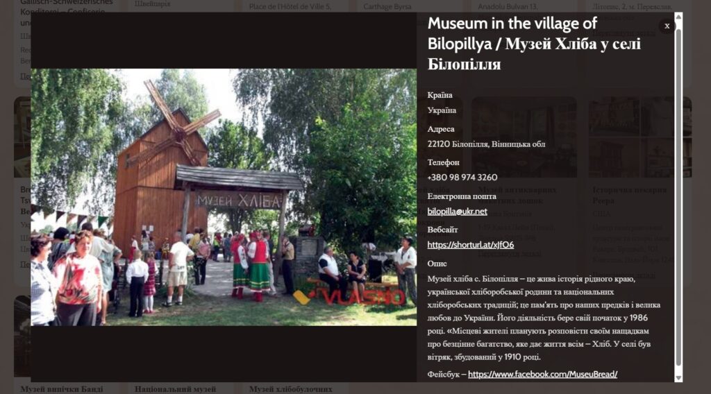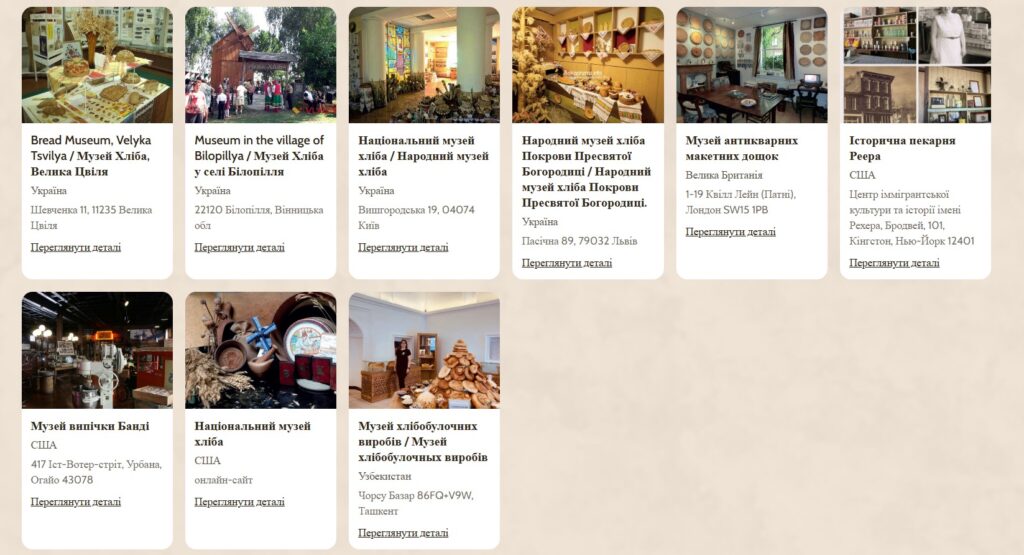 Атлас, доступний за посиланням https://breadculture.net/bread-museums/, містить базову інформацію про музеї, які зберігають і популяризують традиції хлібопекарства, розкривають культурне та духовне значення хліба у житті народів.
