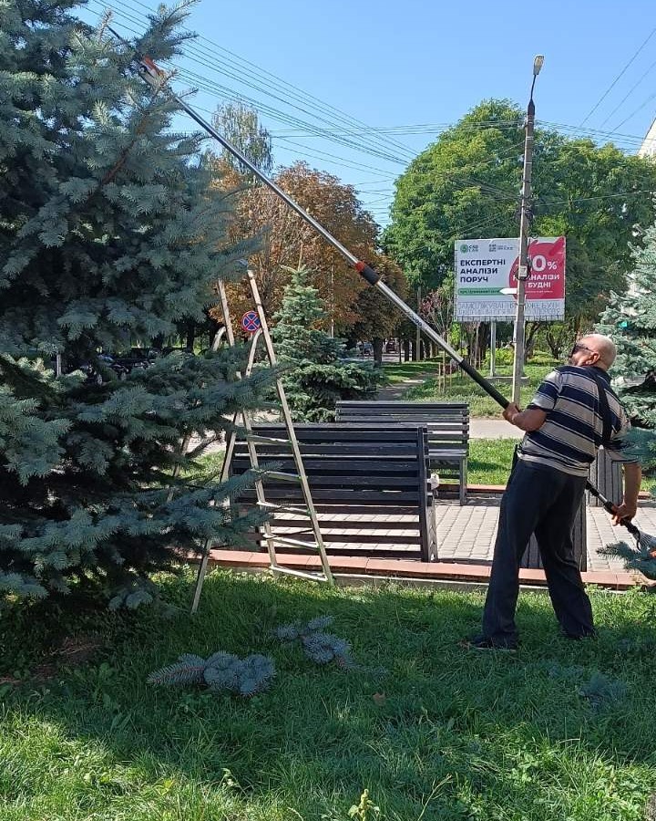 Наразі вони займаються формуванням ялинок біля пам’ятника Михайлу Грушевському. Таке обрізання не лише надає деревам доглянутого вигляду, а й сприяє їхньому здоровому росту.