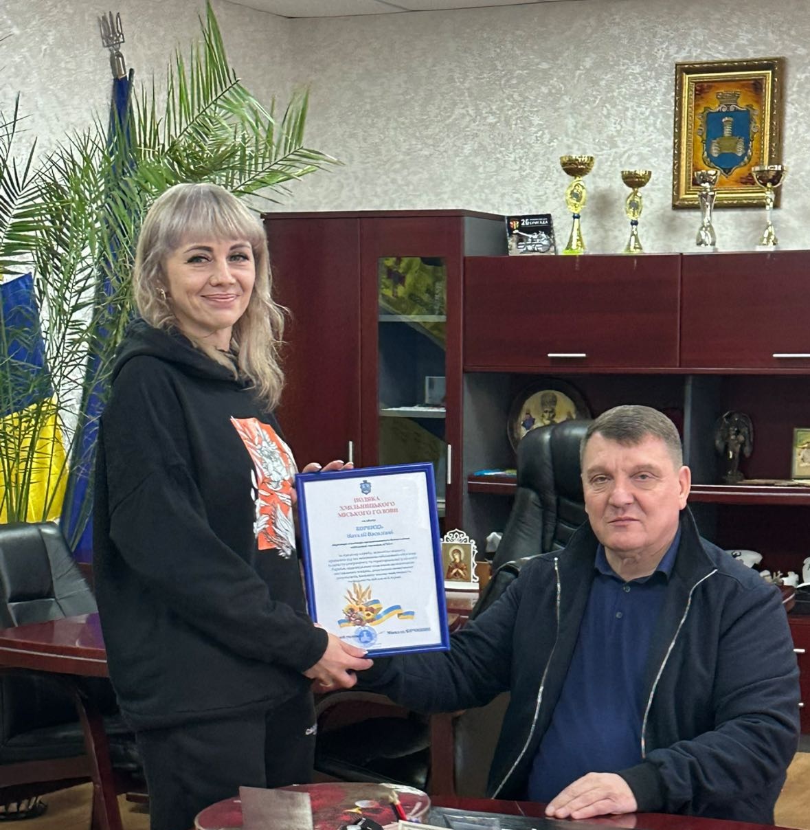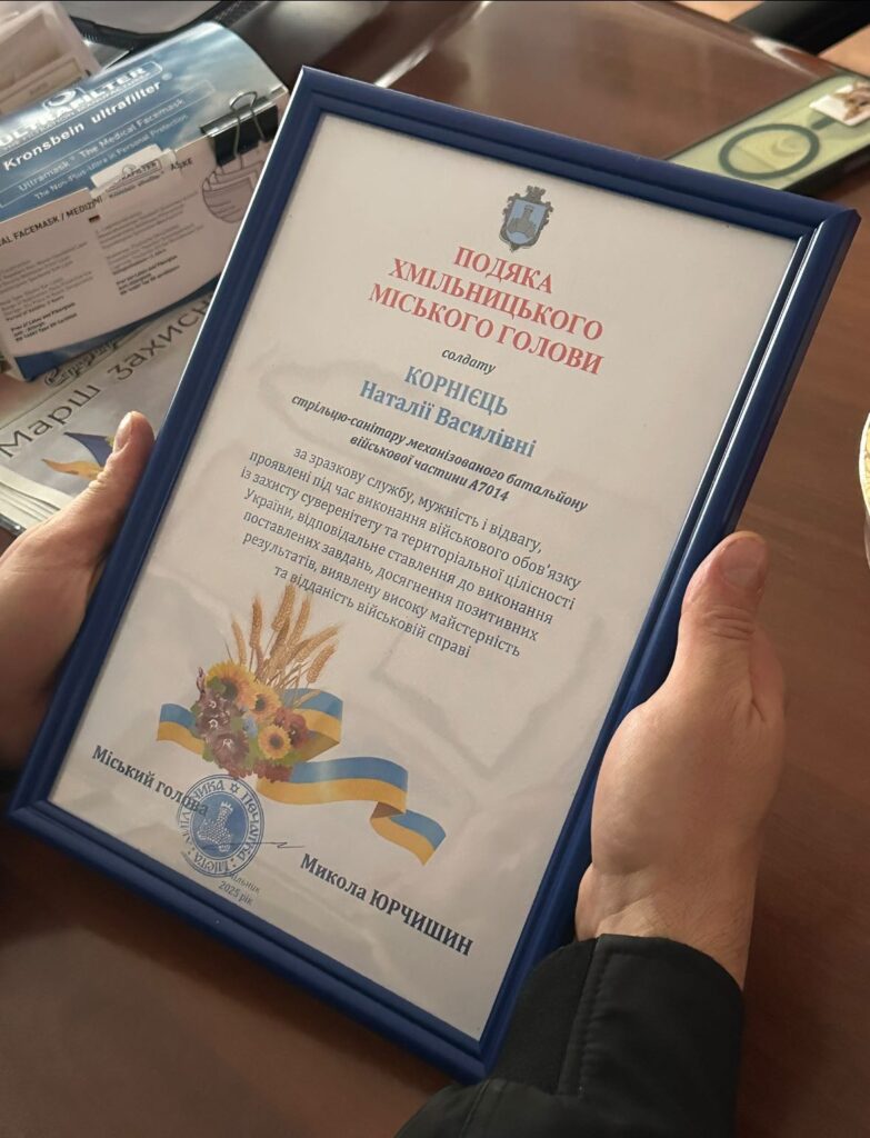У День Гідності та Свободи Хмільницький міський голова Микола Юрчишин вручив подяку солдату Наталії Корнієць — стрільцю-санітару механізованого батальйону військової частини А7014.