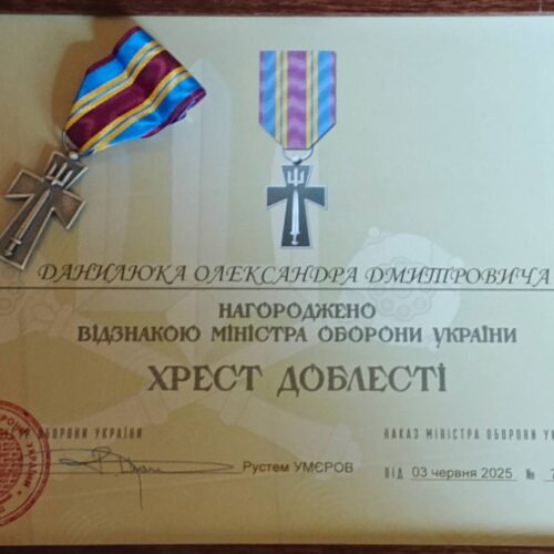 За незламну мужність, зразкову службу та відданість військовому обов’язку Олександр Данилюк нагороджений почесною відзнакою Міністра оборони України — “Хрестом Доблесті”. Це вже друга висока військова нагорода в житті Олександра. У лютому 2023 року він отримав “Золотий Хрест” — відзнаку Головнокомандувача Збройних Сил України. Ці нагороди — визнання його відваги, стійкості та самопожертви заради майбутнього нашої […]