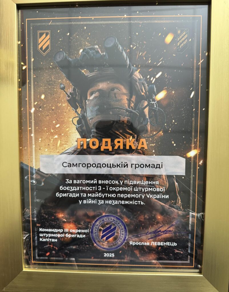 На 67-й сесії 8 скликання Самгородоцької сільської ради депутати ухвалили важливе рішення: з місцевого бюджету виділили 350 тисяч гривень субвенції для 3-ї окремої штурмової бригади (в/ч 4638). Кошти підуть на придбання обладнання, яке допоможе нашим військовим ефективніше боронити країну від російського агресора.