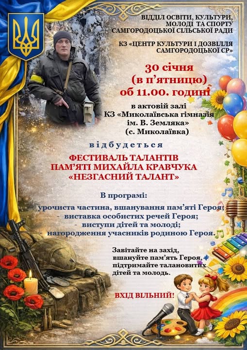 30 січня , у п’ятницю, об 11:00 в актовій залі КЗ «Миколаївська гімназія ім. В. Земляка» (село Миколаївка) пройде Фестиваль талантів пам’яті Михайла Кравчука «Незгасний талант».