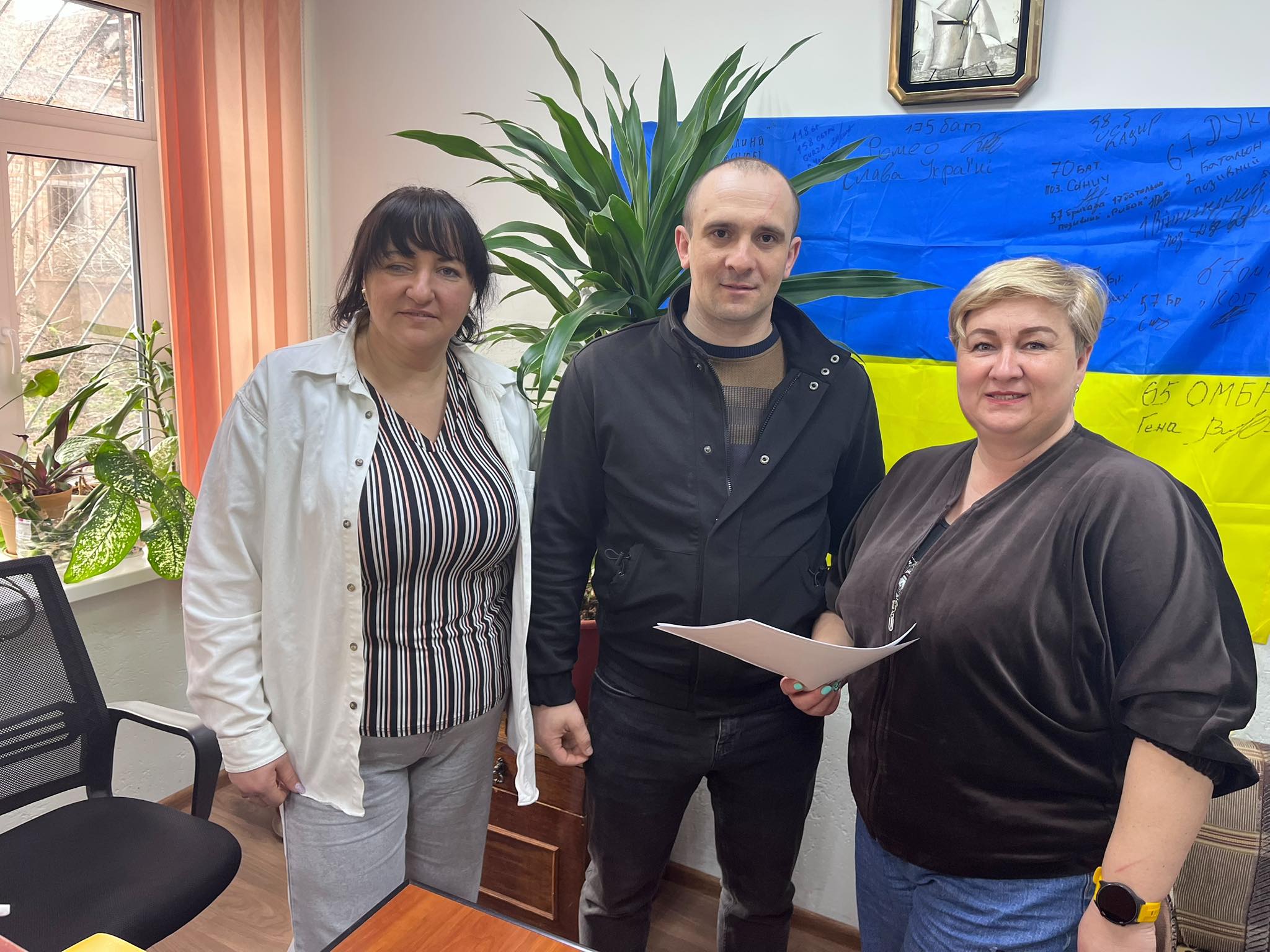 Фахівці із супроводу ветеранів Катерина Полончук та Тетяна Чудновець підписали меморандум про співпрацю з начальником Хмільницького районного відділу №2 філії Державної установи «Центр пробації» у Вінницькій області Сергієм Фютом.