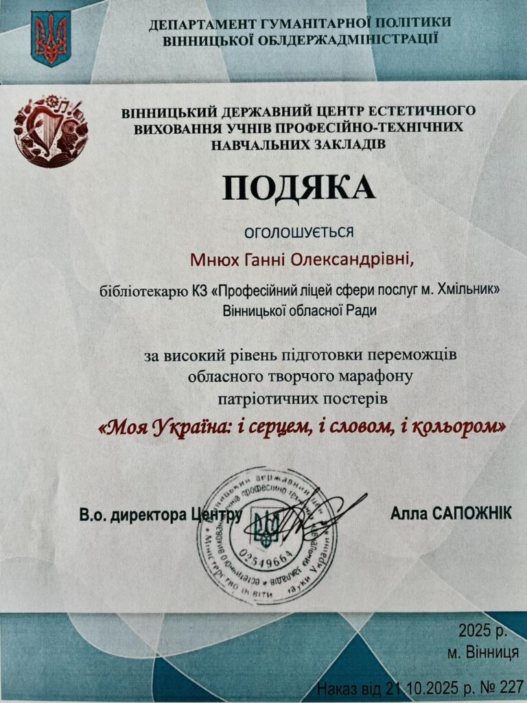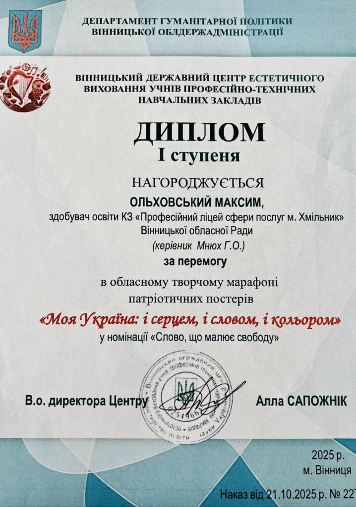 Коли слово набуває кольору, а патріотизм звучить щиро й переконливо — народжуються перемоги. Саме таку історію успіху продемонстрував Максим Ольховський, здобувач освіти КЗ «Професійний ліцей сфери послуг м. Хмільник» Вінницької обласної Ради.