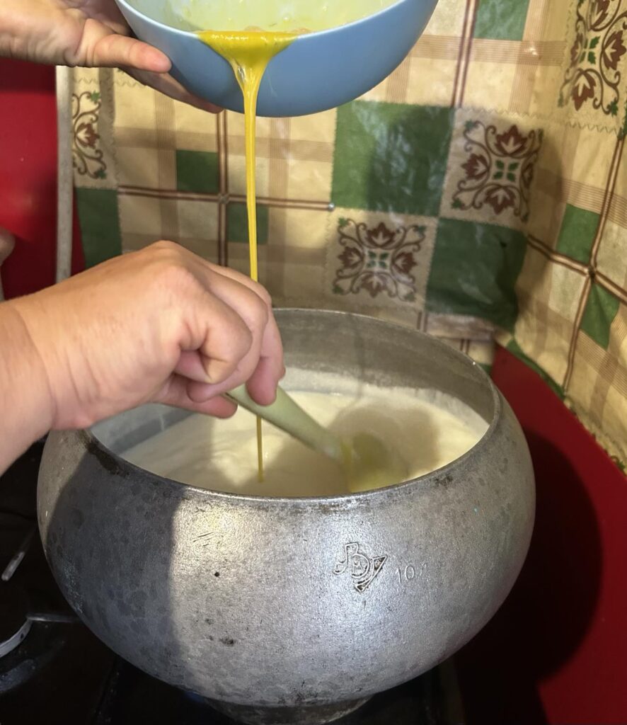 Спершу розпалюють піч. Молоко доводять до кипіння, додають промитий рис і варять близько 15 хвилин. Окремо яйця розтирають із цукром, після чого суміш тонкою цівкою вливають у кашу, постійно помішуючи. Додають частину вершкового масла, а потім ставлять казан у піч на 3–4 години. У готову страву додають решту масла.