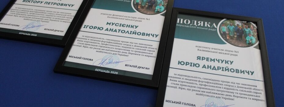 У Калинівці відзначили трьох освітян, які долучилися до будівництва фортифікаційних споруд у Донецькій області. Під час робочого візиту до громади Бершадський міський голова Віталій Драган вручив їм Подяки. Він особисто працював разом із педагогами на сході, де очолював групу від Вінниччини. «Ці хлопці працювали зі мною майже на лінії вогню. Дванадцять діб – без відмовок, […]