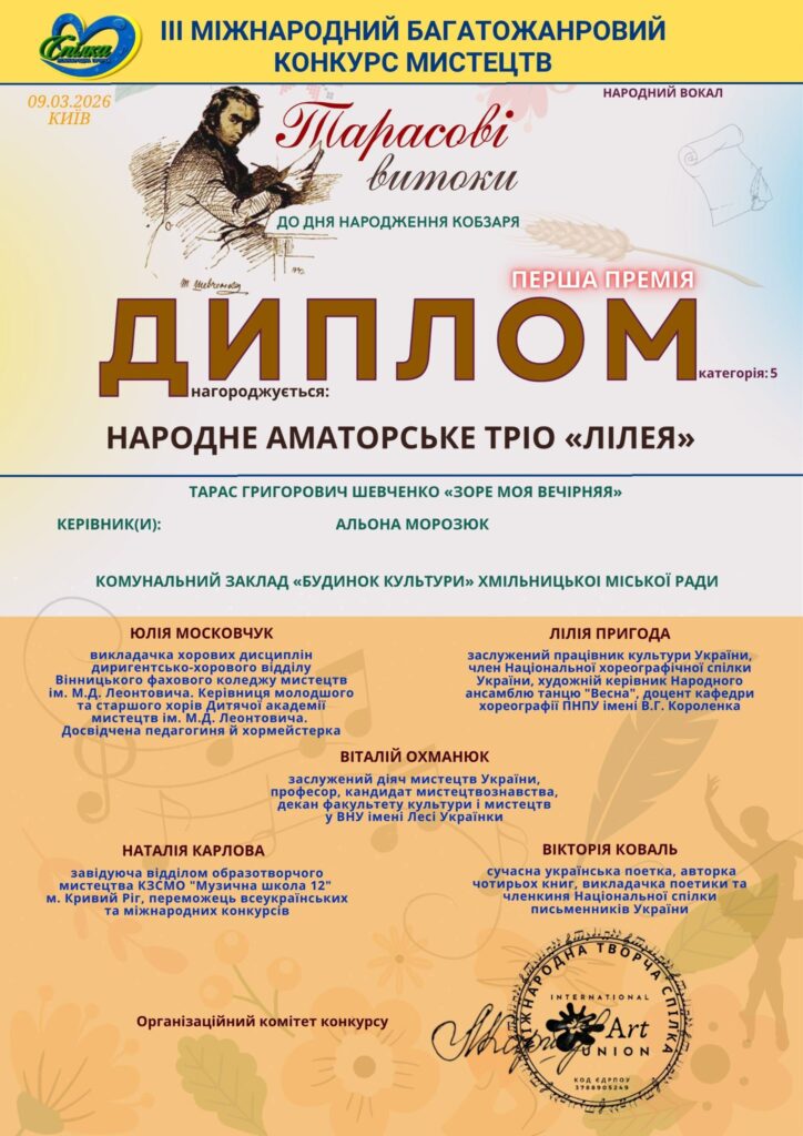 Народне аматорське тріо «Лілея» Комунального закладу «Будинок культури» Хмільницької міської ради здобуло І премію у ІІІ Міжнародному багатожанровому конкурсі мистецтв «Тарасові витоки».