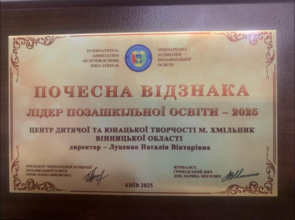 За значний внесок у підтримку й розвиток позашкільної освіти Центр дитячої та юнацької творчості Хмільника був удостоєний почесної відзнаки «Лідер позашкільної освіти – 2025».