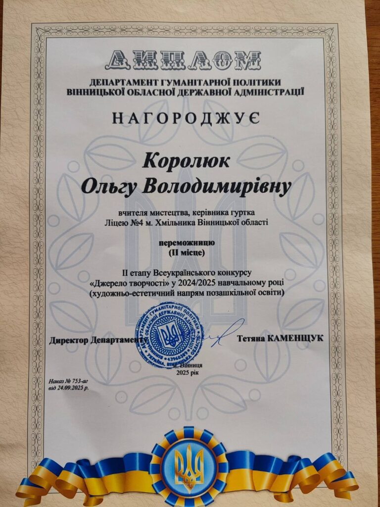 Вчителька музичного мистецтва КЗ «Хмільницький ліцей №4» Ольга Королюк виборола почесне друге місце у ІІ етапі Всеукраїнського конкурсу «Джерело творчості».