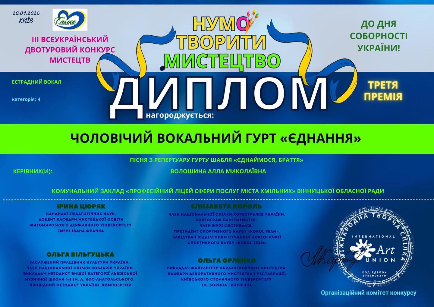 Чоловічий вокальний гурт «Єднання» комунального закладу «Професійний ліцей сфери послуг м. Хмільник» Вінницької обласної Ради став лауреатом ІІІ премії ІІІ Всеукраїнського двотурового конкурсу мистецтв «Нумо творити мистецтво», приуроченого до Дня Соборності України.