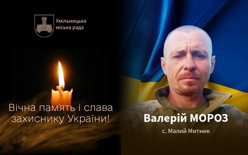 Зі скорботою Хмільницька міська рада повідомила, що під час виконання бойового завдання поблизу населеного пункту Українське Покровського району Донецької області 12 вересня 2024 року загинув сержант Мороз Валерій Петрович, 1977 року народження, уродженець села Малий Митник Великомитницького старостинського округу Хмільницької міської ради.