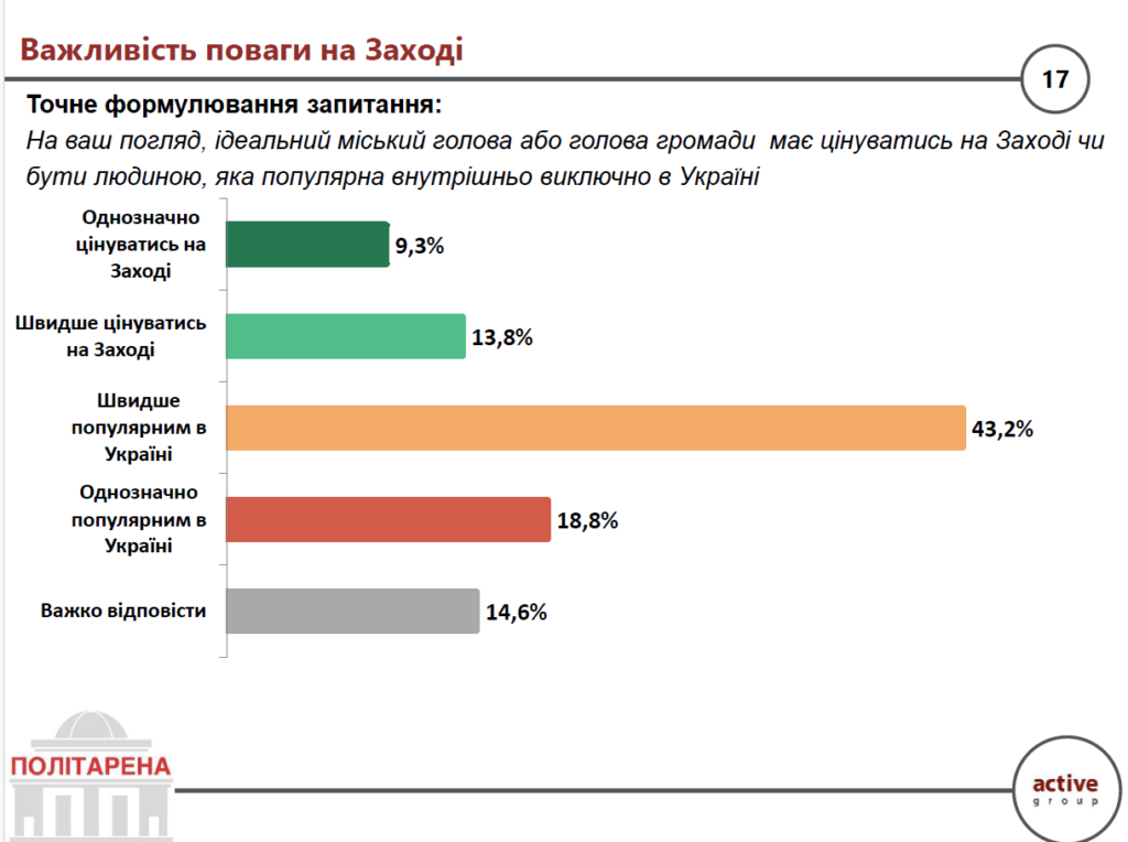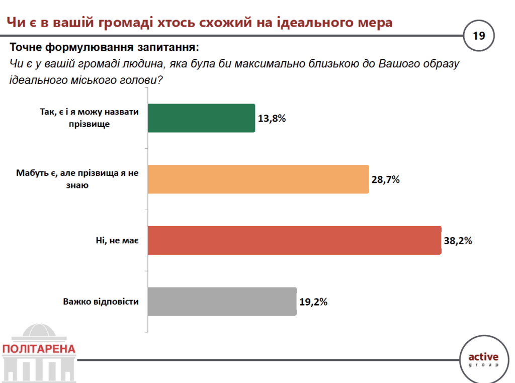 Водночас 38,2% українців заявили, що у їхній громаді немає людини, яка відповідає образу ідеального мера. Ще 19,2% не змогли визначитися. Лише 13,8% назвали конкретне прізвище.
