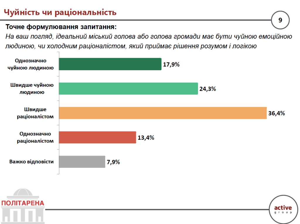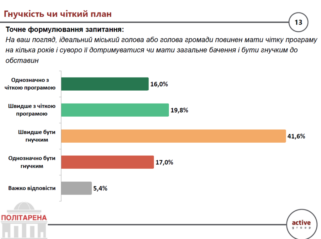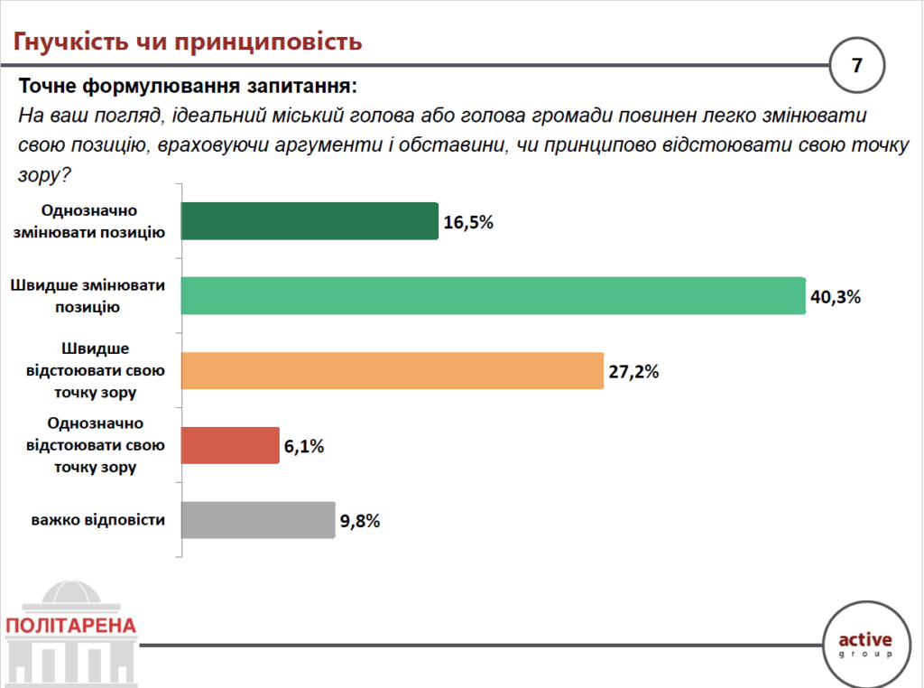 Понад 70% респондентів очікують від мера виважених рішень після консультацій. 56,8% підтримують здатність змінювати позицію залежно від аргументів та обставин, а 73,1% — готовність до компромісів заради результату.