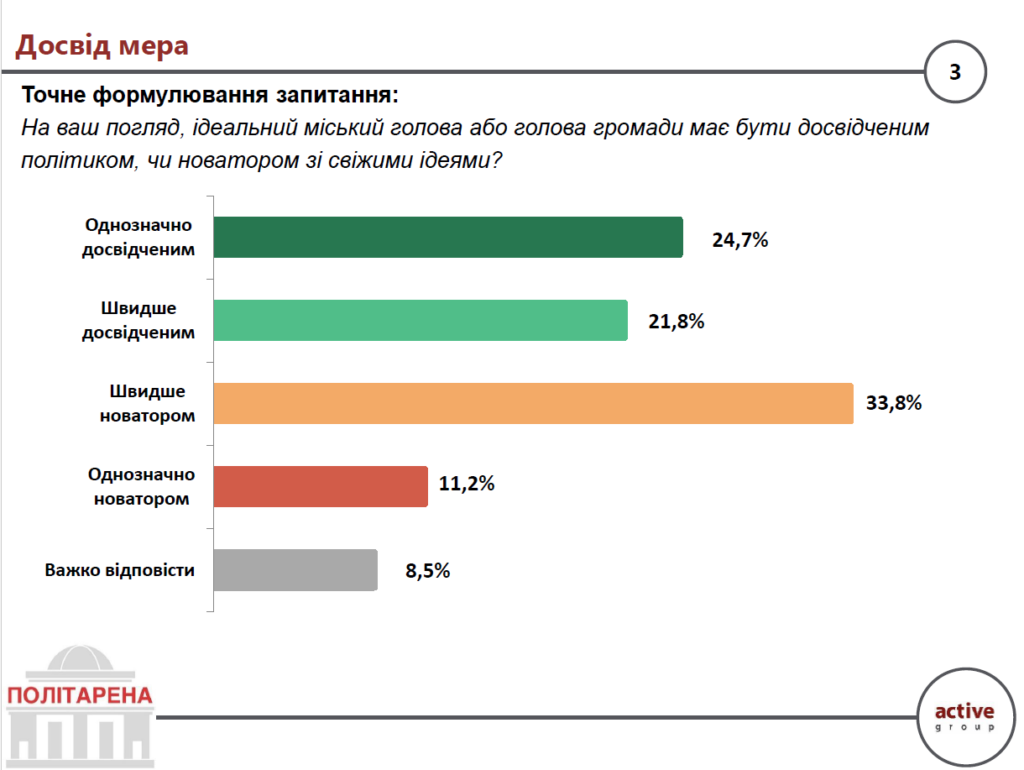 Думки українців практично розділилися: 46,5% надають перевагу досвідченому політику, тоді як 45% — новатору зі свіжими ідеями. Схожий баланс і в питанні освіти та практичного досвіду: незначна перевага — за практиками, однак вимога хорошої освіти залишається для багатьох принциповою.