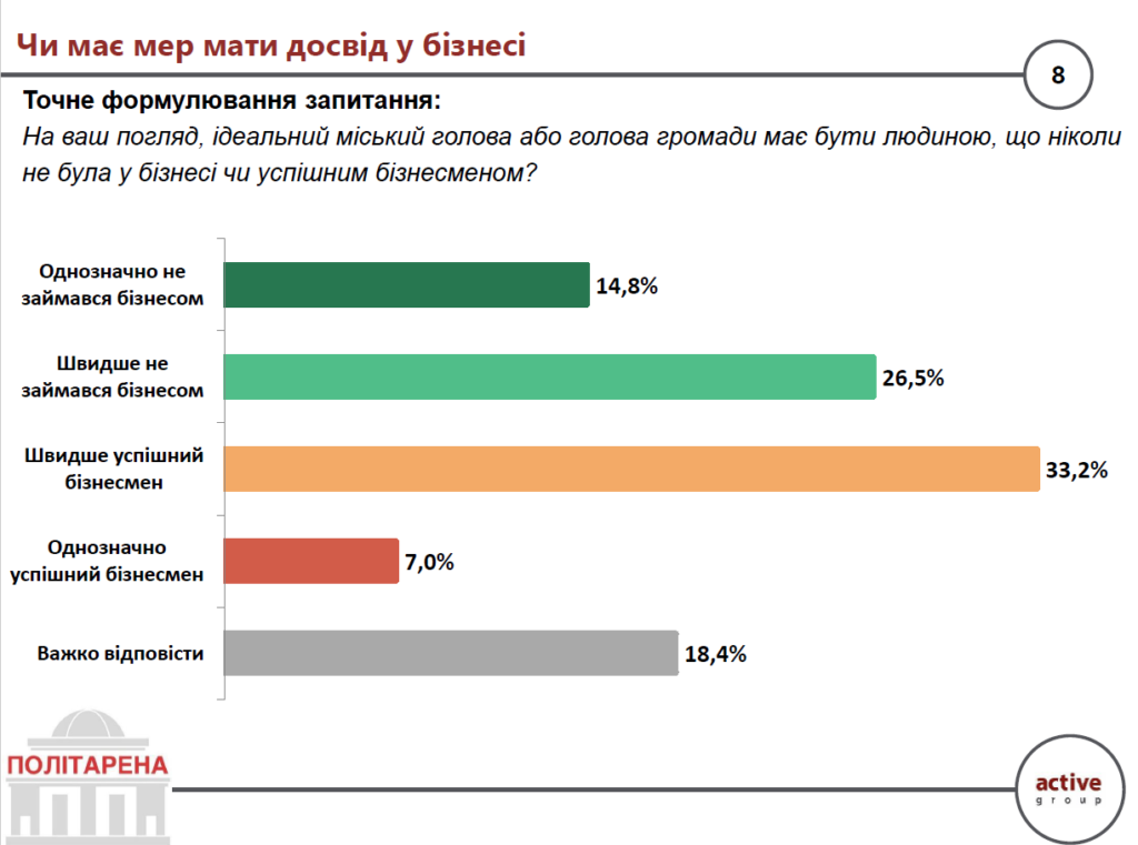 Щодо бізнес-досвіду — суспільство також розділене. 40,2% хотіли б бачити успішного підприємця, 41,3% — людину, яка не займалася бізнесом.