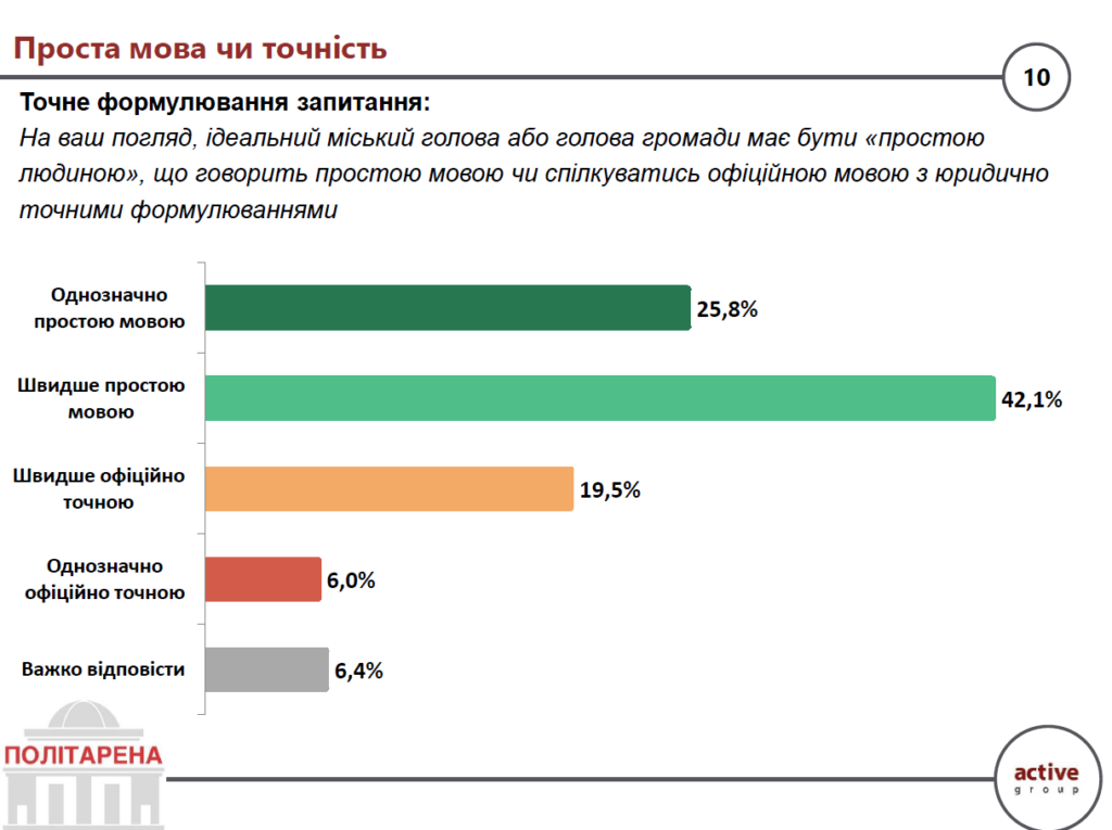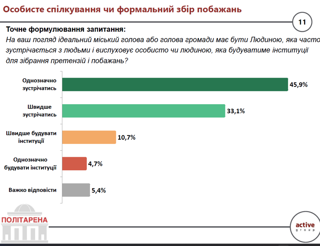67,9% українців очікують, що міський голова говоритиме простою та зрозумілою мовою. Ще більш чіткий запит — на особисту комунікацію: 79% вважають, що мер має регулярно зустрічатися з людьми.
