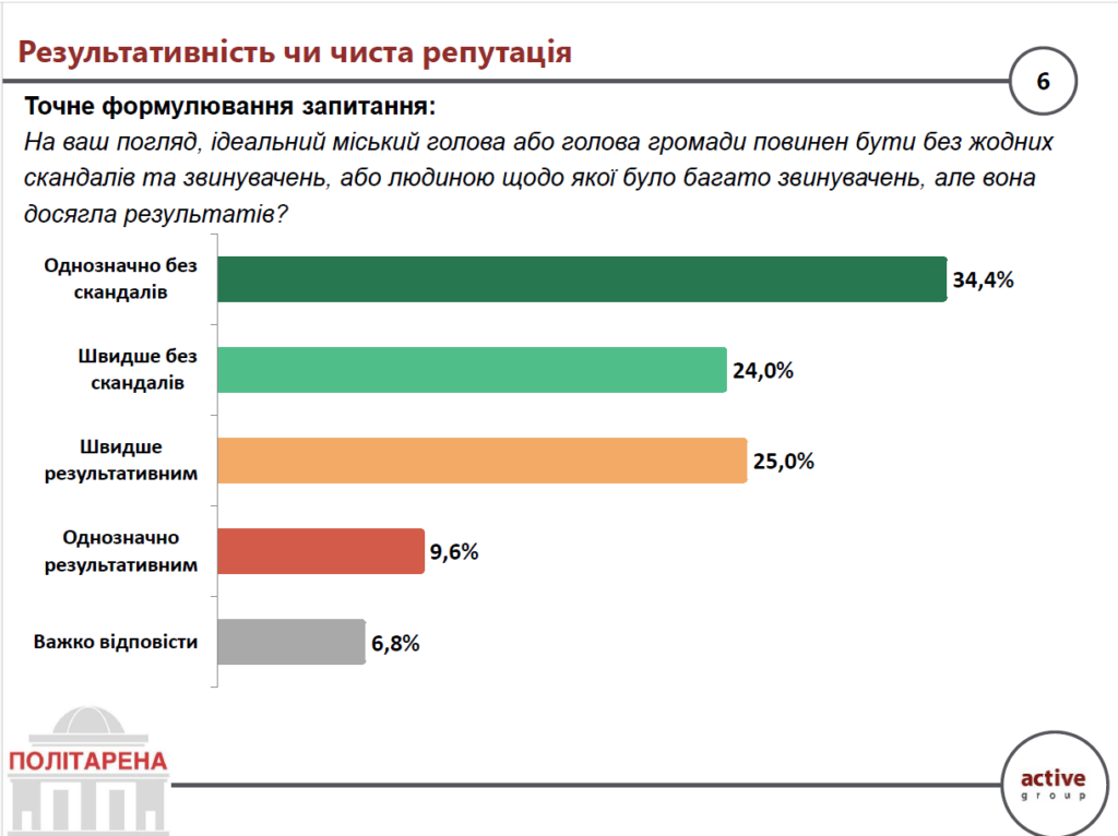 Найбільш однозначною стала відповідь щодо репутації: 58,4% переконані, що ідеальний мер має бути без жодних скандалів чи звинувачень. Лише третина готова підтримати результативного, але скандального керівника.