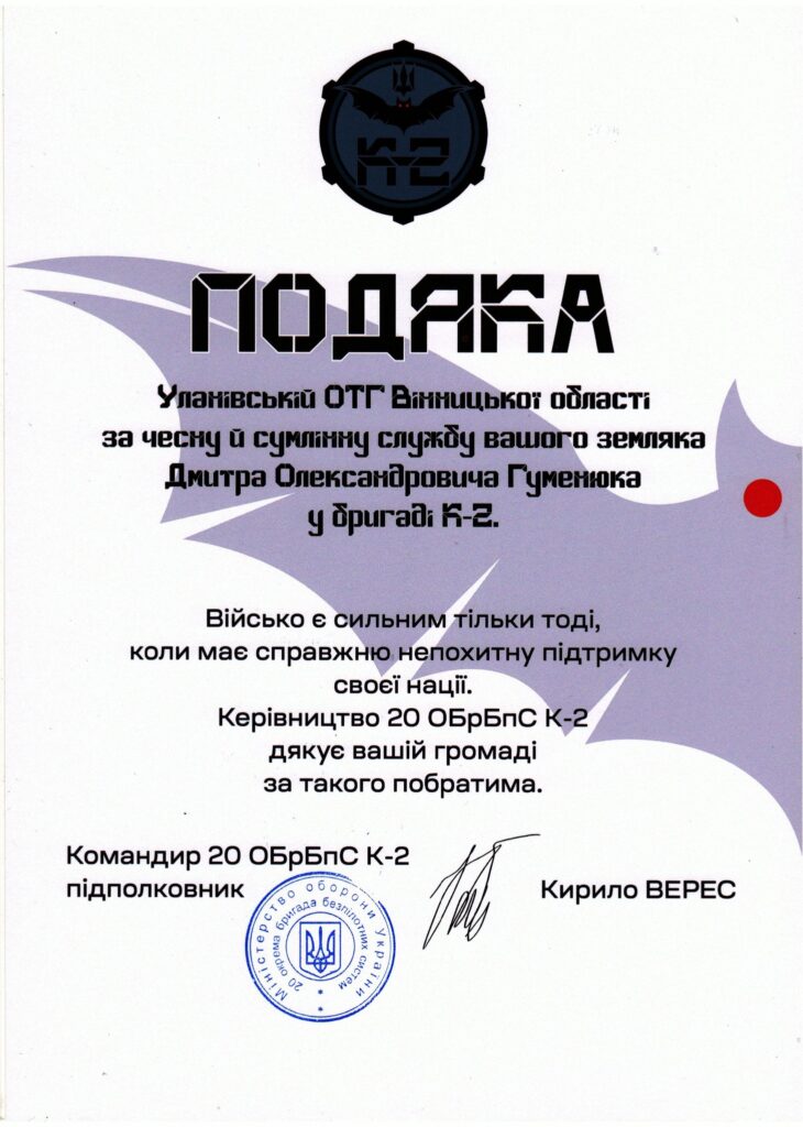 Слова подяки лунають і на адресу батьків Дмитра Гуменюка — за виховання гідного сина та справжнього патріота своєї держави.