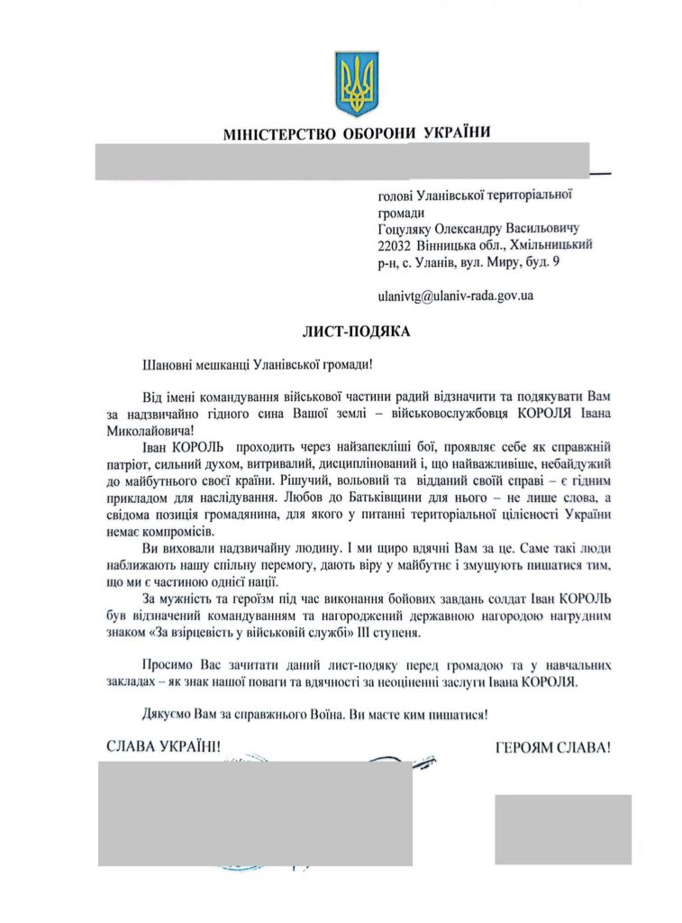До Уланівської сільської ради надійшов лист-подяка від командування військової частини, де проходить службу наш земляк – житель села Пагурці Іван Миколайович Король.